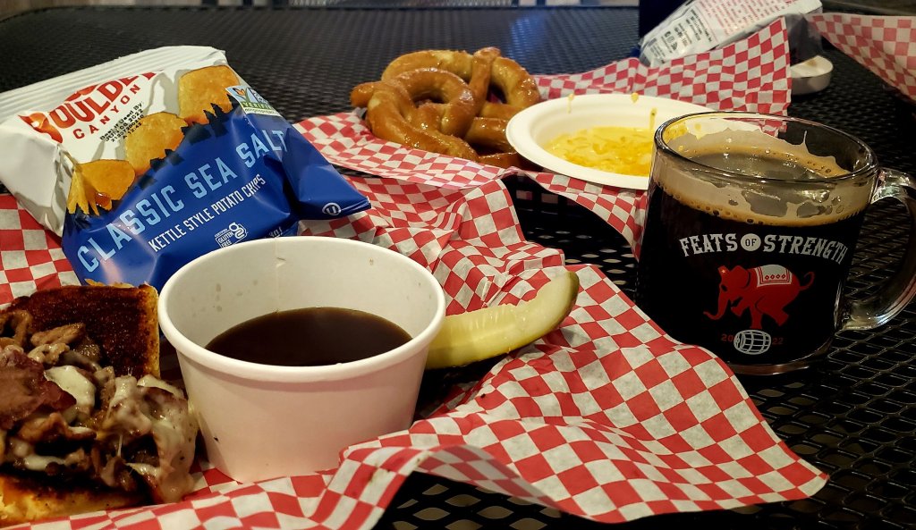 We started with pretzels and beer cheese sauce, then split the French Dip. It was more than enough food, especially with the tasty brews. I had the Feats of Strength, a winter beer brewed by several Western Slope craft brewers. I liked it so much, I bought the cool glass mug! There’s a punch card, and if you visit all eight participating breweries you can enter to win a $25 gift card at each location. Dirty Hippie is Palisade Brewing’s most popular beer. Try it if you haven’t.