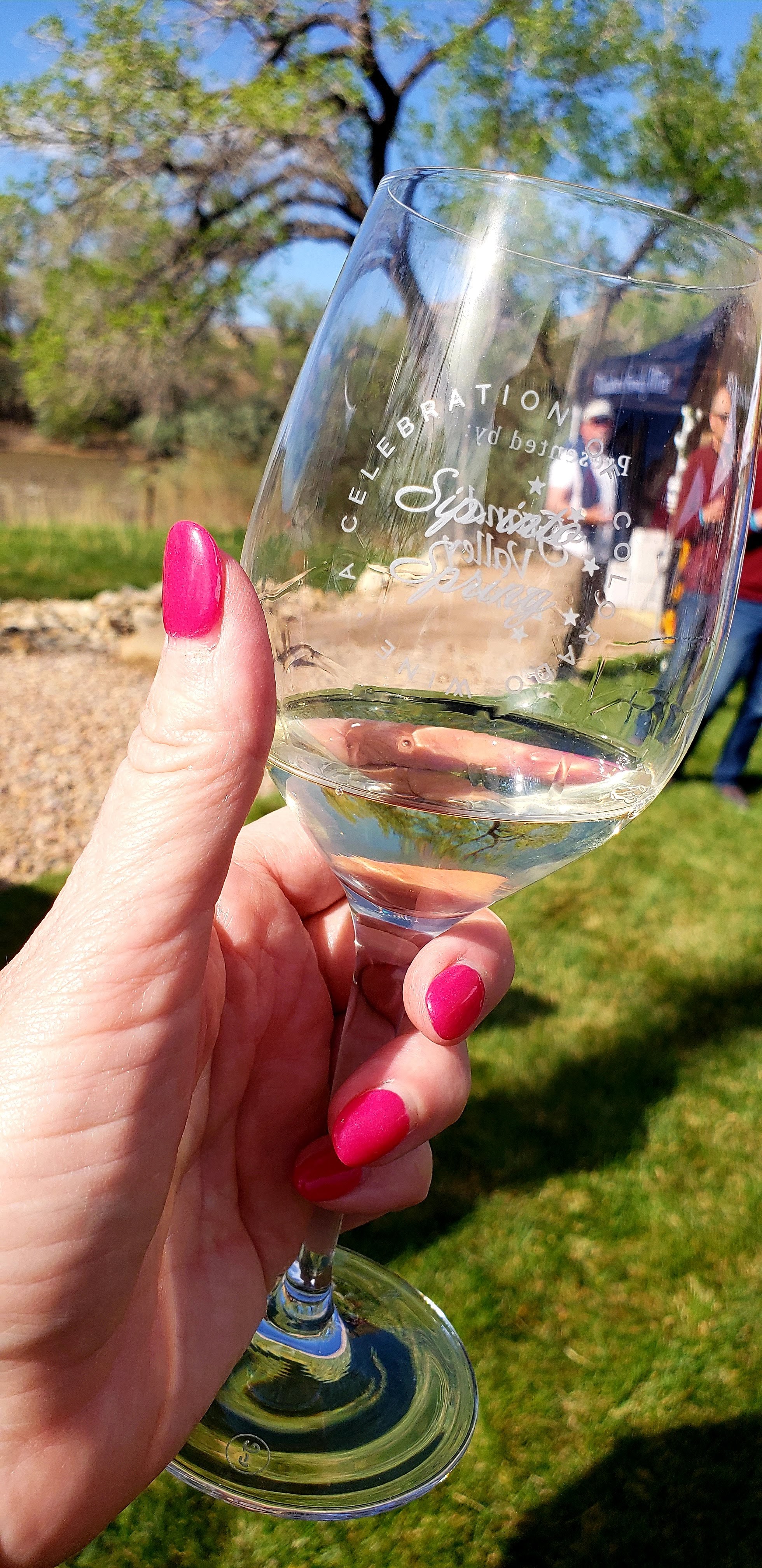 The venue, Orchard River View, was perfect for this. There’s a big, beautifully restored barn with a giant sparkling chandelier that makes me want to go to a wedding there. If you plan one, please invite me. There were food trucks in the parking lot on one side, and a lawn that gently slopes down to the bank of the Colorado River on the other side. That’s where the wine tents and live music were set up. You never know what kind of weather you’ll experience in late April and early May in Colorado, but we were blessed with a warm, sunny spring day.